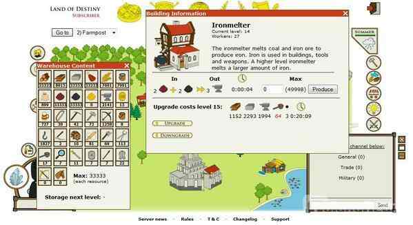 Allgemein: Land of Destiny (LoD) ist ein Echtzeit-Strategiespiel, das zusammen mit tausenden anderen Spielern online gespielt wird. Nach der Registrierung startest Du mit einem kleinen Zeilt irgendwo in der weiten Spielwelt. In der Nähe Deines Zeltes befindet sich ein kleines Lager das Du benötigst, um Deine Stadt aufzubauen. Deine ersten Schritte im Spiel sollte die Sicherstellung Deines Nahrungsbedarfs sein, damit Deine Einwohner nicht verhungern.. In Deinem Zelt kannst Du Bevölkerung rekrutieren, die Du als Arbeiter in Deinen Gebäuden einsetzen kannst. Wenn Du erstmal einen Jäger hast wird es Zeit Dich um Bretter und Steine zu kümmern. Land of Destiny bietet eine vielzahl an Waren, dies macht das Spiel interessant und umfangreicher gegenüber anderen Browserspielen. Jedes Gebäude benötigt sein eigenes Werkzeug. Bretter werden bicht vom Holzfäller produziert, dafür mußt Du erst die Baumstämme im Sägewerk bearbieten lassen.Das Produktionssystem von LoD ist von dem Spiel Die Siedler inspiriert worden. Handel: Mit dieser großen Anzahl von Materialien macht es Sinn mit anderen Spielern zu handeln. Dies wird möglich, wenn das Stadtzentrum gebaut wurde. Mit jedem Upgrade des Stadtzentrums wird ein weiterer Händler zur Verfügung stehen. Dies wird es Dir leicht machen Dein Dorf zu vergrößern. Wettersystem: LoD hat ein aktives Wetter und Jahreszeiten System. Das Wetter wird zufällig täglich je nach Jahreszeit variieren. Jede Woche beginnt eine neue Jahreszeit. Sowohl die Jahreszeit als auch das Wetter haben Einfluß auf die Produktionen und den Abbau von Resourcen. Deshalb ist es wichtig das Lager auszubauen, so dass auch im Winter noch Korn zu Mehl verarbeitet werden kann. Nebel und Regen kann auch Auswirkungen auf den Aussichtsturm haben. Kampfsystem: Du bist nicht allein im Land of Destiny. Wenn Du Dich auf der Karte umschaust, wirst Du sehen, dass Du von anderen Spielern umgeben bist. Du kannst Dir Freunde oder Feinde machen. Wenn Du einen anderen Spieler angreifst, kannst Du Matterialien für Dein Dorf erbeuten! Derzeit hat das Spiel 18 verschiedene Militäreinheiten. Alle haben Stärken und Schwächen. Deshalb ist es wichtig die richtigen Einheiten für die Aufträge auszuwählen. Eine interessante Möglichkeit ist es Camps und Außenposten zu gründen. In einem Camp kann der Geologe schon ein Mal die Berge auf Bodenschätze untersuchen. Möglicherweise findet er Gold! Außerdem können sich die Soldaten in einem Camp sammeln, und von dort aus einen Feind angreifen. Außerdem kann man ein Gebiet auf der Karte übernehmen und dort einen Außenposten gründen. Der Außenposten kann verschiedene Größen haben. Vom Wachposten bis zur Burg. Jedes Upgrade vergrößert die Reichweite des Außenposten und die Verteidigungsmöglichkeit. Außerdem können mehr Soldaten in dem Außenposten einquartiert werden. Wenn ein Dorf in der Reichweite eines Außenpostens ist, wird es durch den Außenposten beschützt. So ist es nicht nötig Soldaten im Dorf zu haben. Erfahrene Spieler können einen Außenposten oder Dorf mit Generälen und Führern übernehmen. Sogar die Zerstörung von Gebäuden durch Katapulte ist möglich. Aber keine Angst Dein erstes Dorf kann niemals eingenommen werden. Imperial Schutz (fur gelegentliche Spieler): Spieler die es vorziehen friedlich Ihr Dorf aufzubauen ohne Angst vor Überfällen haben zu müssen, können das Imperiale Schutzsystem gebrauchen. Über dieses System kannst Du Soldaten des Imperiums anheuern, die Deine Dörfer und Außenposten schützen. Dies verringert die Gefahr eines Überfalls. Es ist sogar möglich einen Vollschutz zu erhalten. In dem Fall kann man das Dorf gar nicht mehr angreifen. Natürlich ist die Leistung nicht kostenlos zu bekommen. 20% bis 50% Deiner Produktionen wirst Du als Steuer an das Imperium bezahlen müssen. Empire / Allianz: Eines Tages ist das Dorf groß genug um einen Außenposten zu gründen. Dort ist es möglich ein Hauptquartier zu bauen. Zusammen mit Freunden kann dann der Spieler ein eigenes Empire gründen. Jedes Empire kann sein eigenes Wappen kreieren. Außerdem hat jedes Empire ein eigenes Forum. Ein Empire kann gegen andere Empire Krieg führen oder mit Diplomatie Nicht Angriffs Pakte schließen. Jeder Ausbau des Hauptquartiers ermöglicht es dem Empire mehr Spieler aufzunehmen. Wenn das Hauptquartier Level 15 erreicht hat, ist es sogar möglich eine Allianz mit anderen Empires zu bilden. Es ist wichtig das Empire Hauptquartier gegen Feinde zu schützen, da es möglich ist das Gebäude zu zerstören oder den Außenposten mit einem General zu übernehmen. Dies wird automatisch zur Zerschlagung des Empires führen. Kaiserliche Stadt: In der Hauptstadt ist es möglich in der Burg um Schutz durch die Imperialen Soldaten zu bitten. Die Imperialen Soldaten werden Dein Dorf gegen Angiffe feindlicher Truppen verteidigen. Ebenso können in der Stadt Minispiele gegen andere Spieler gespielt werden. In der Kneipe kann man sein hart verdientes Geld im Blackjack oder in Scheere Stein Papier setzten und vielleicht der reichste Spieler von Land of Destiny werden.