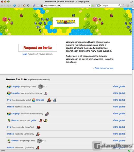 Weewar.com ist ein rundenbasiertes online Strategiespiel. Bis zu 6 Spieler koennen ihre Armeen gleichzeitig gegeneinander antreten lassen. Dazu befehligen sie jede Menge bunter Panzer, Infanteristen und Artillerie auf einer der unzähligen Karten.