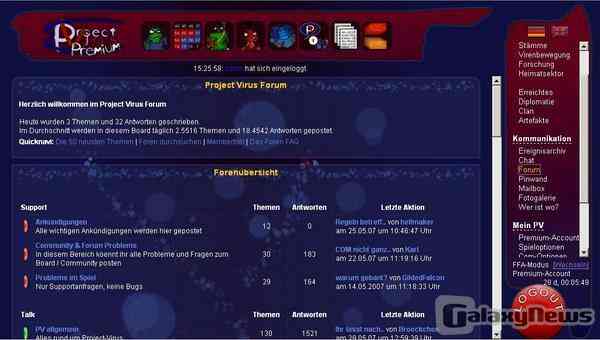 GildedFalcon: Mein Kumpel und Mitentwickler Christian Bott hat das ganze gestartet. Er ist eines morgens aufgewacht und hat sich gedacht: Ich mach' jetzt mal ein Spiel, das mir gefällt. Dieser Käse auf dem Markt ist ja nicht auszuhalten in Sachen Echtzeitstrategie. Das war vor über 6 Jahren. Nach ein paar Wochen Entwicklung erzählte er mir von seinen Plänen und da bin ich aufgesprungen. Seine ursprüngliche Idee war etwas mit Computerviren zu machen, aber die Idee hat sich nicht so durchgesetzt, so dass wir zu lebendigen Viren übergingen. Wir fanden schnell Unterstützung im Bekanntenkreis und es entstand ziemlich schnell eine kleine Community, auf deren Anregungen hin wir das Spiel immer weiter entwickelt haben. Das setzt sich aktuell noch immer so fort, nur dass die Community deutlich gewachsen ist. An dieser Stelle will ich auch noch mal sagen, dass wir ohne Legadith, unseren Serveradministrator, Robert Kemmeter von orange-webdesign.com und Darkelement, der die Virenbilder designed hat, nicht dort wären, wo wir heute sind.